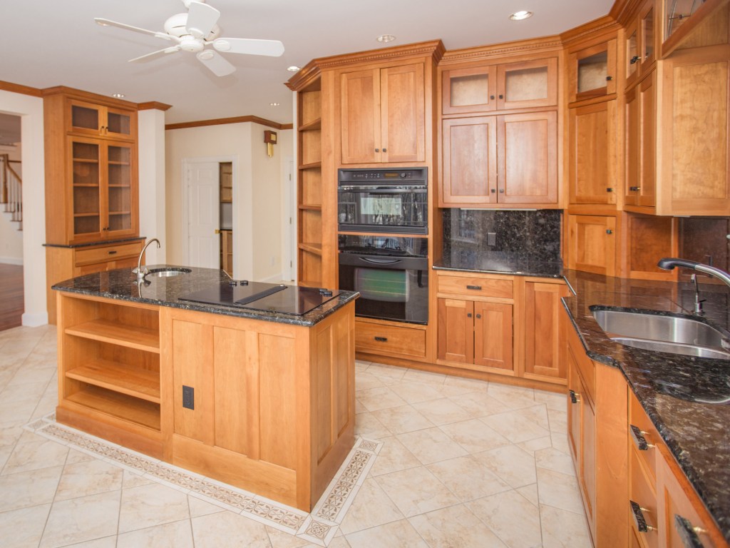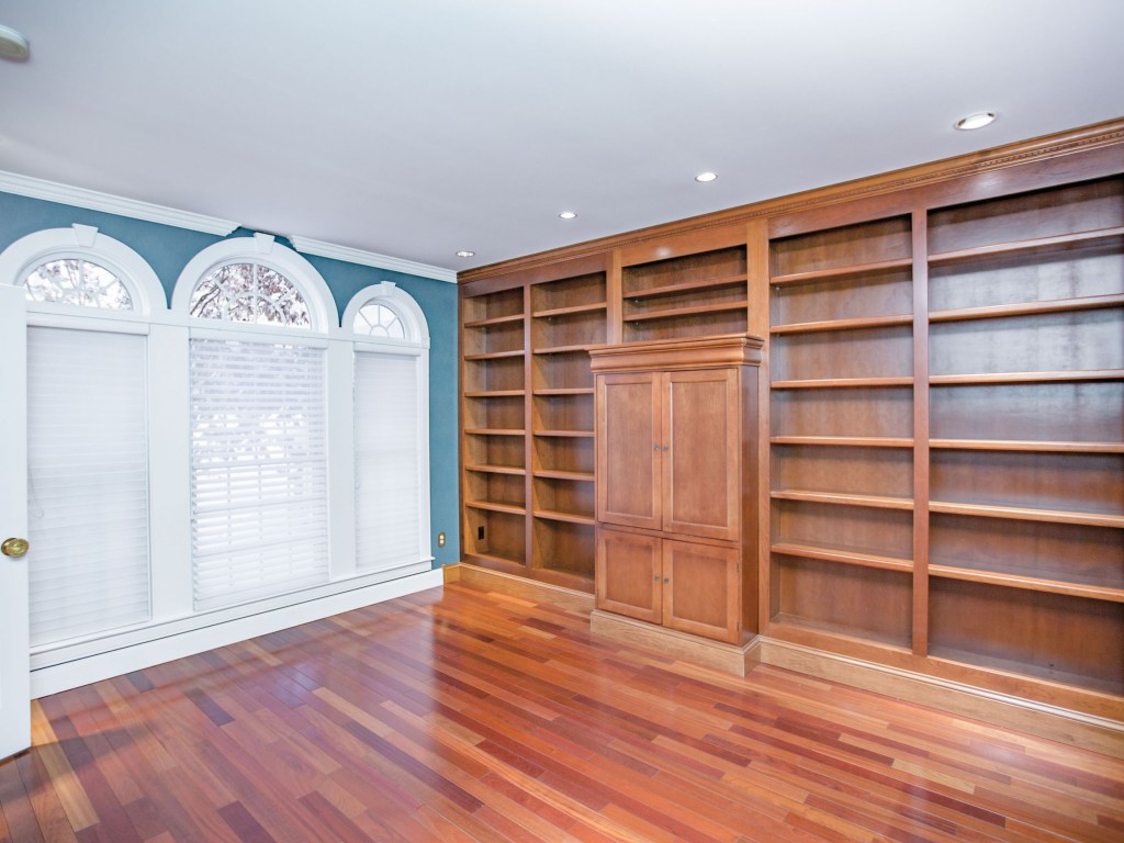 There are two fireplaces: one in the great room, and one in the master bedroom. Floors are a warming cherry (though not in the tiled kitchen or the heated, three-vehicle garage, whose Swisstrax tile was installed for storage of an antique car.) The lovely gourmet kitchen’s cabinetry is cherry, too, complementing granite surfaces; and the library (note its trio of Palladian windows) has a wall of cherry built-ins.