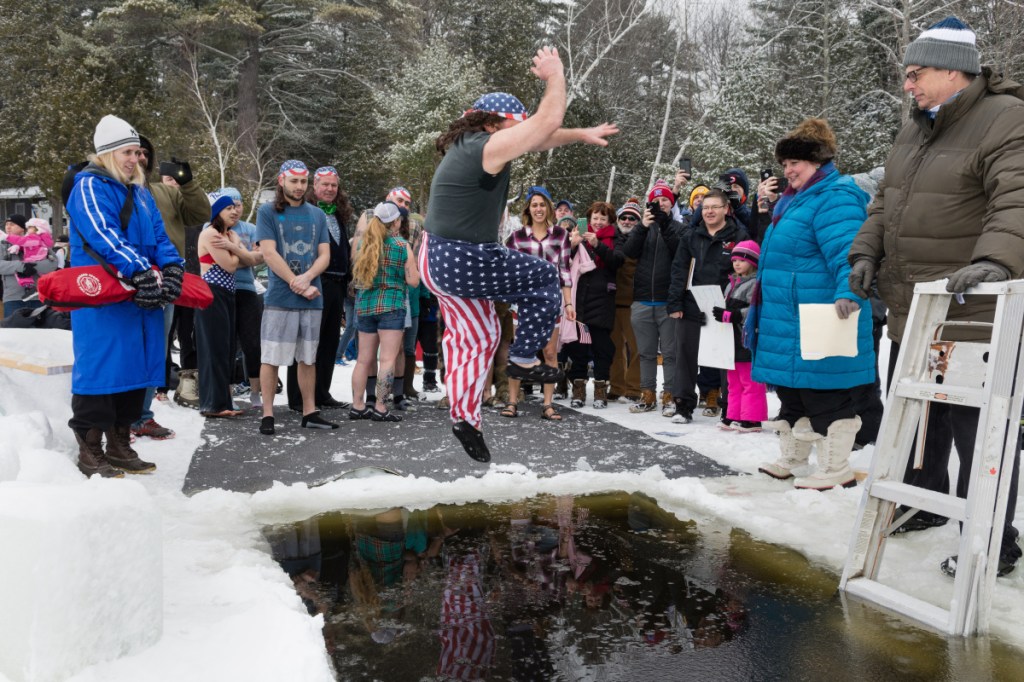 Tony Tuell, of Silver Street Tavern in Waterville, was the first to take the plunge into the frigid 4-foot-deep cutout in Messalonskee Lake. He was dressed in stars-and-stripes pants and remained in the icy water until the rest of his team jumped.