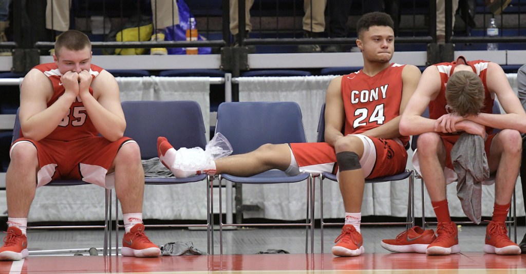 The senior guard was Cony’s brightest spot in the first half, driving the lane and knocking down fadeaways and runners en route to 12 points. But he stepped on Lausier’s foot while performing a crossover after corraling a loose ball, and went down with 4:17 to play. He couldn’t put weight on the ankle and was forced to leave with Cony trailing 43-30.
