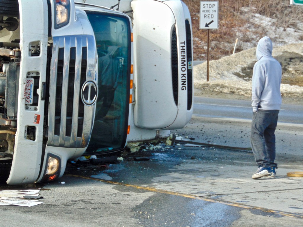 Waterville police Chief Joe Massey said the truck was traveling north on Interstate 95 just after noon and exited toward Kennedy Memorial Drive. At that point, the driver, Bertram Ware, of Warwick, Rhode Island, realized the truck’s brakes were not working properly. Ware, 36, saw another vehicle stopped ahead of him, Massey said, and though he had been intending to turn right onto the street, he swerved left to avoid the car ahead of him. When the truck entered Kennedy Memorial Drive, Massey said, Ware then tried to make a sharp right turn.
