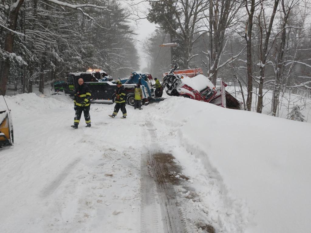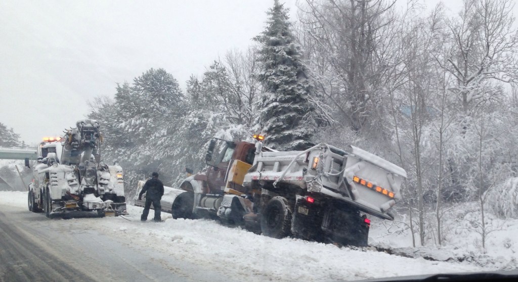 In Livermore, a tow truck pulling a town plow truck up a hill Thursday morning lost traction and started to slide backward on River Road. The trucks jackknifed and the tow truck hit a utility pole and broke it. The plow truck, which had broken down during the night, went down an embankment. A short time later, a plow was reported off the road in Turner.