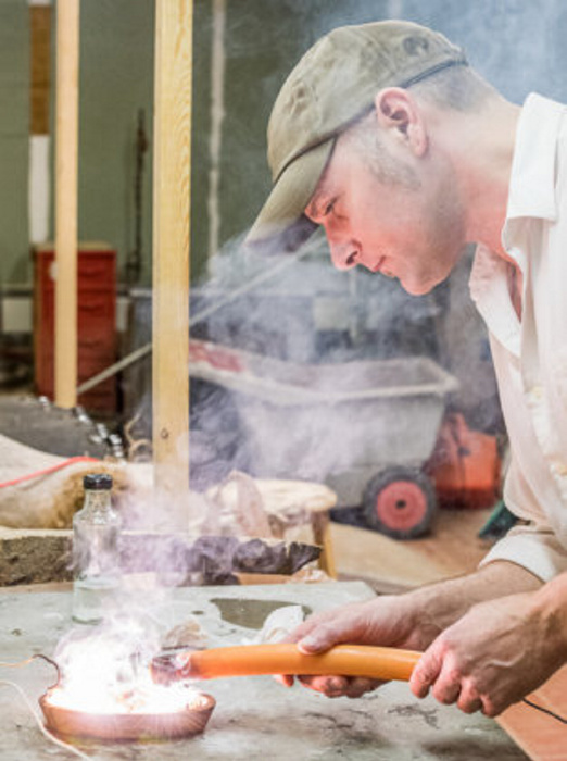 These days, their collaborations are industrious without the death-defying elements. Using mostly found or scavenged objects, they’re making tables, chairs and lamps out of wrenches, gears and braided wires. They’re electrifying ax handles and wooden bowls to create oddly beautiful effects, and they’re turning Grandma’s vintage silverware into wearables.