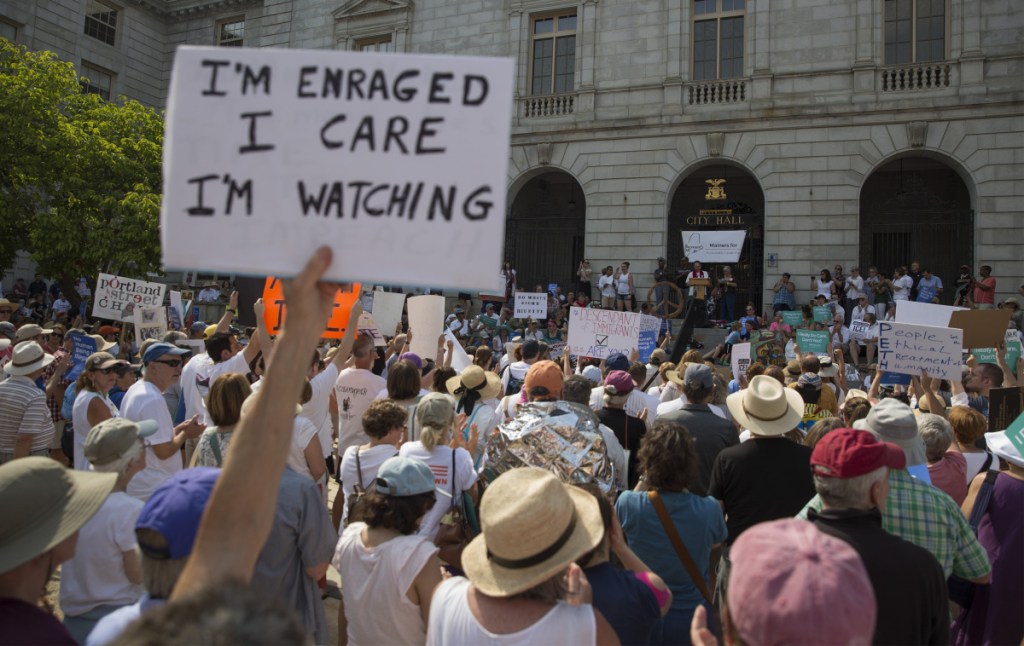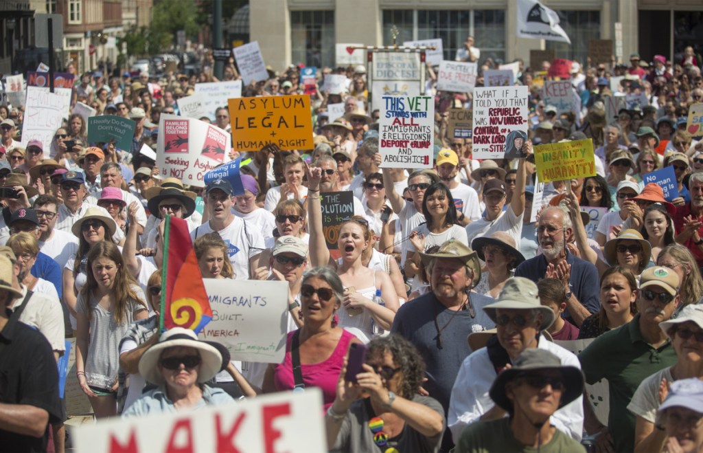The crowd chanted enthusiastically, sang and applauded wildly while listening to a dozen speakers over two hours in 80-degree heat. The event was one of more than 600 “Families Belong Together” protests and marches held in all 50 states Saturday, a coordinated effort to bring attention to President Trump’s immigration policies, specifically the practice of separating immigrant children from their parents at the southern border. Protests were also held elsewhere in Maine, including Brunswick, Augusta, Farmington, Bangor and Bar Harbor.