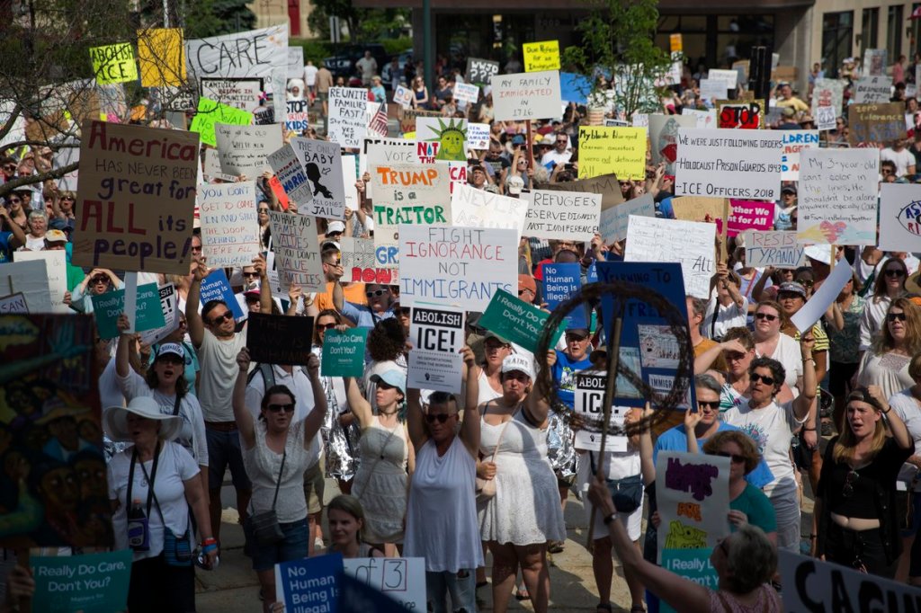 He said seeing news reports in recent months of children being separated from their parents made him “mad as hell.” He asked the crowd if they, too, were mad as hell, and the answer was a resounding yes.