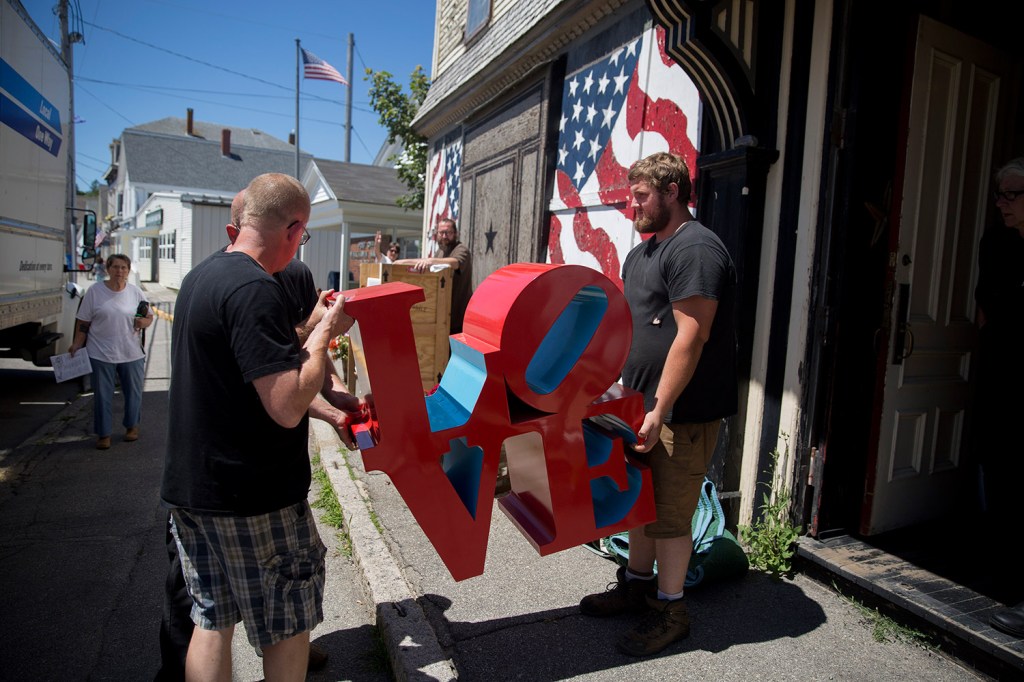 Mark Spelman, center, Gavan Soule, right, and Peter Whitney remove a “Love” sculpture from Robert Indiana’s home and pack it up in a crate for shipping.