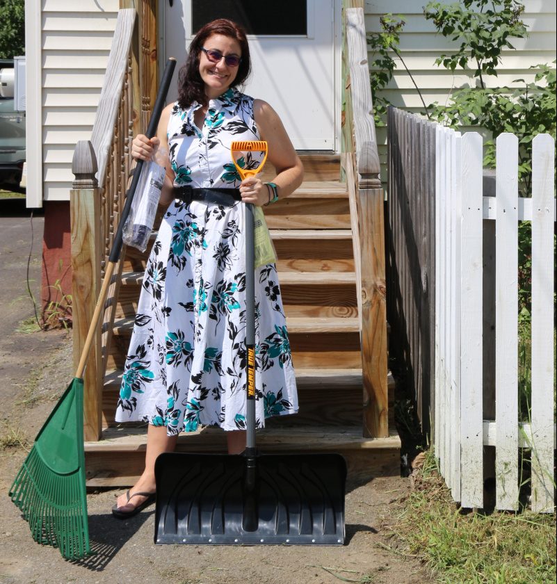 Anna Holdener stands ready for the changes in the seasons with a rake and a shovel in front of her new home on Water Street in Waterville recently.