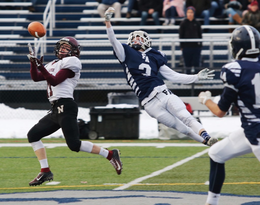 Saunders intercepted Haining at the Fryeburg 34 with 6:20 left. On third down, Fryeburg tried a halfback pass and Nathan Knapp got open, but the pass was off target, forcing a punt.