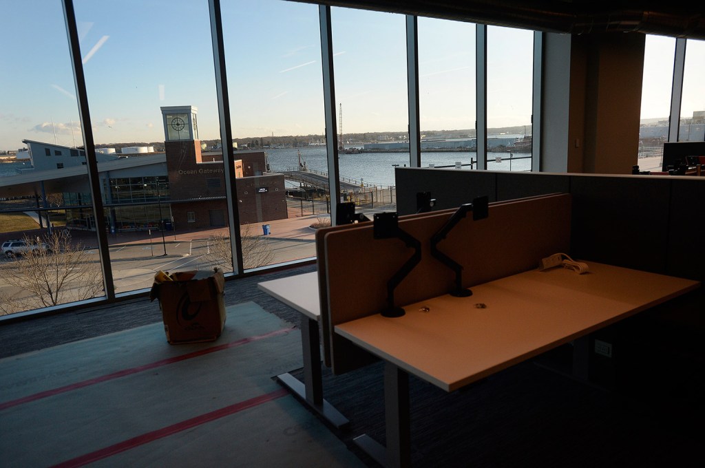 The headquarters, being built by Pittsfield-based Cianbro Corp., incorporates copious amounts of glass paneling for a more open feel. About 90 percent of the office areas will be open floor space with low cubicles, versus about 10 percent of space with discrete offices, Cobaj said. A relatively large percentage of space will be dedicated to unassigned seating and collaborative areas for employees to get together and work as teams, he said.