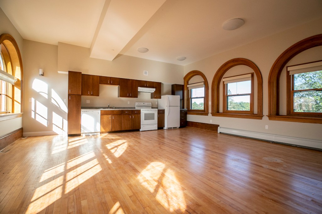 The stunning Chapel remains intact, as do features such as gorgeous woodwork and stained-glass, arched, and leaded-glass windows. Apartment rentals are being handled by DC Management.