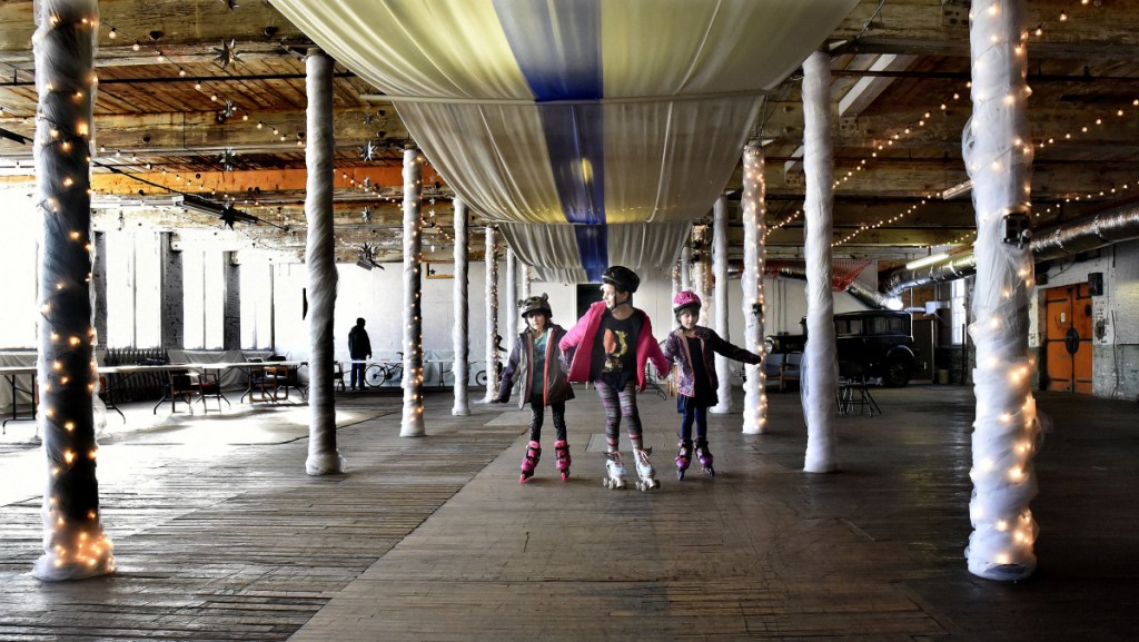 There were in-line skates, roller blades, roller skates, scooters and bikes tooling around on the antique wooden floors as part of the Save the Olde Mill Vassalboro fundraiser. White lights were hung from the rafters and one could smell popcorn popping.