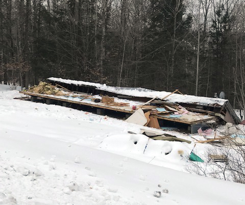 The collapse was reported first at 12:57 p.m. Deputies noticed a significant snow load on the roof of the mobile home, but also noted that all interior walls had been removed. The single-wide mobile home appears to have shifted to the rear as it collapsed.
