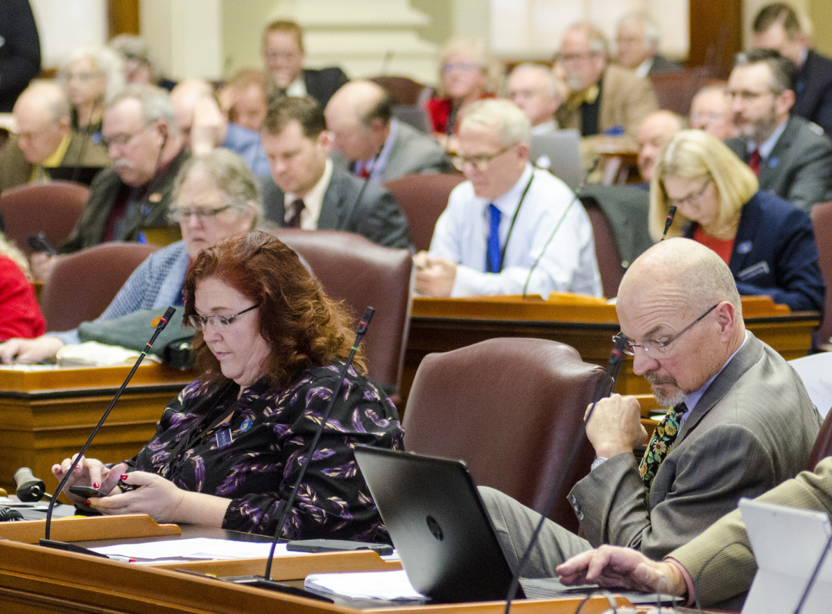 Rep. Shelley Rudnicki, R-Fairfield, and Rep. Larry Lockman, R-Bradley, sit in the front row of the Maine House of Representative during a session on Thursday at the State House in Augusta.