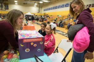 In the gymnasium, kids visited booths where they could make crafts, play games, and jump around.