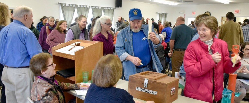A large turnout of Thorndike residents lined up to cast ballots and elected a new board of selectmen and overwhelmingly passed an ordinance to create a municipal fire department during the annual Town Meeting on Saturday. Morning Sentinel by David Leaming