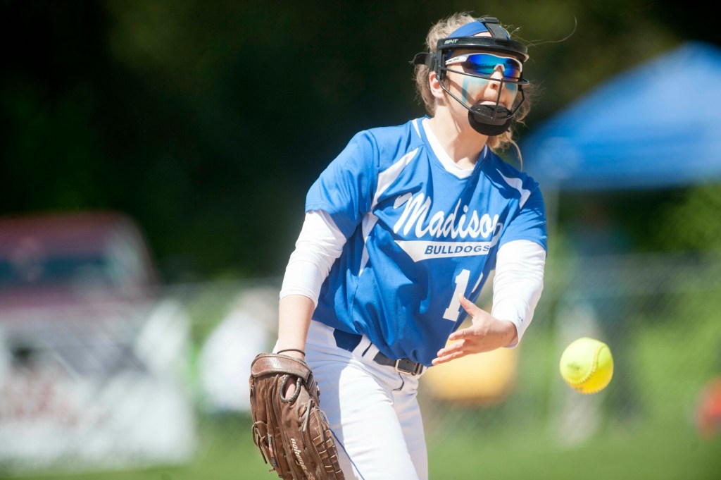 Madison pitcher Lauria LeBlanc delivers a pitch during a Class C South semifinal game Saturday afternoon against Maranacook in Madison. Morning Sentinel photo by Michael G. Seamans