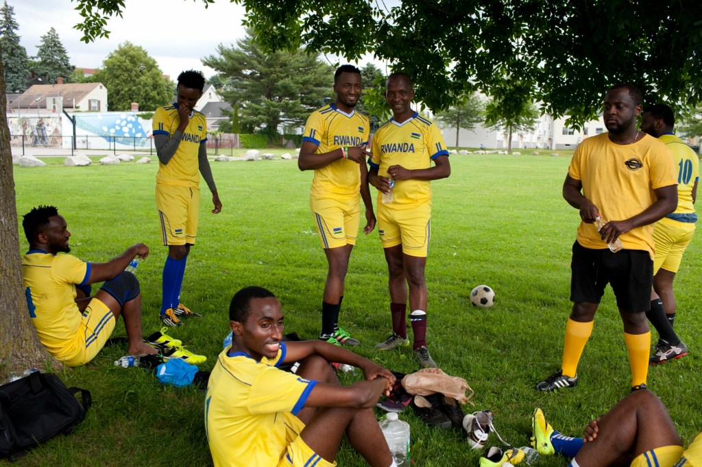 On Sunday, teams from the Rwandan and Angolan communities kicked off first. Rain clouds glowered overhead as the Angolans, organized and tenacious in firetruck red, pushed the ball up the field to score. Rwanda, in bright yellow, came off the field at halftime drenched in sweat and listened to a pep talk from their coach.