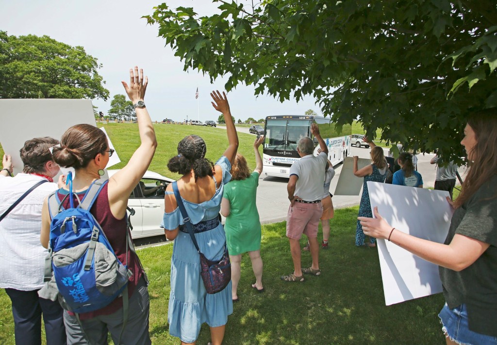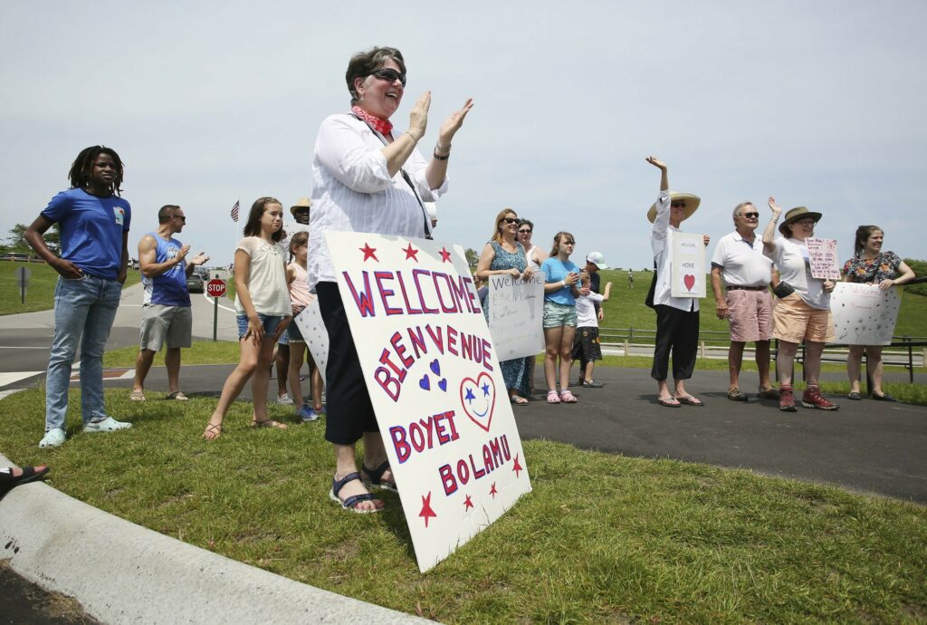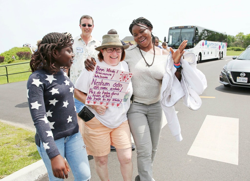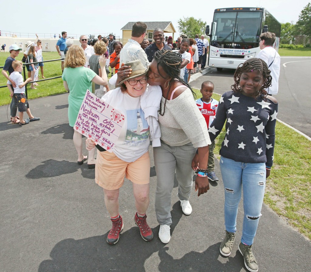 McGovern, who also teaches English to asylum seekers in Portland, stationed herself near the entrance to Fort Williams Park along with several others who had handmade “Welcome” signs to greet the buses carrying asylum seekers. Although “a tiny drop” in the overall scheme of things, McGovern said she wanted to do something to help people seeking refuge in Maine from violence and turmoil elsewhere.
