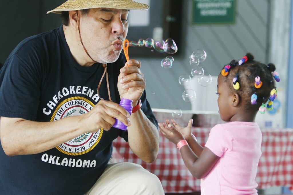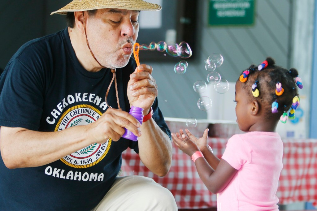 Volunteer Jim Alberty blows bubbles with a young guest at Thursday’s Fourth of July picnic in Cape Elizabeth for asylum seekers. Jill Brady/Staff Photographer