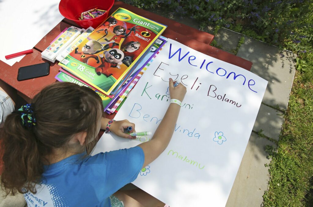 Lily Powers, 13, of Bath makes a poster with various translations of “welcome” for Thursday’s picnic for asylum seekers at Fort Williams Park. Jill Brady/Staff Photographer