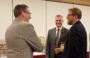 A reception was held for new University of Maine System Chancellor Dannel Malloy at the University of Maine at Farmington on Tuesday. From left are Malloy, UMF President Edward Serna and UMF Professor of History Chris O’Brien. Pam Harnden/Livermore Falls Advertiser