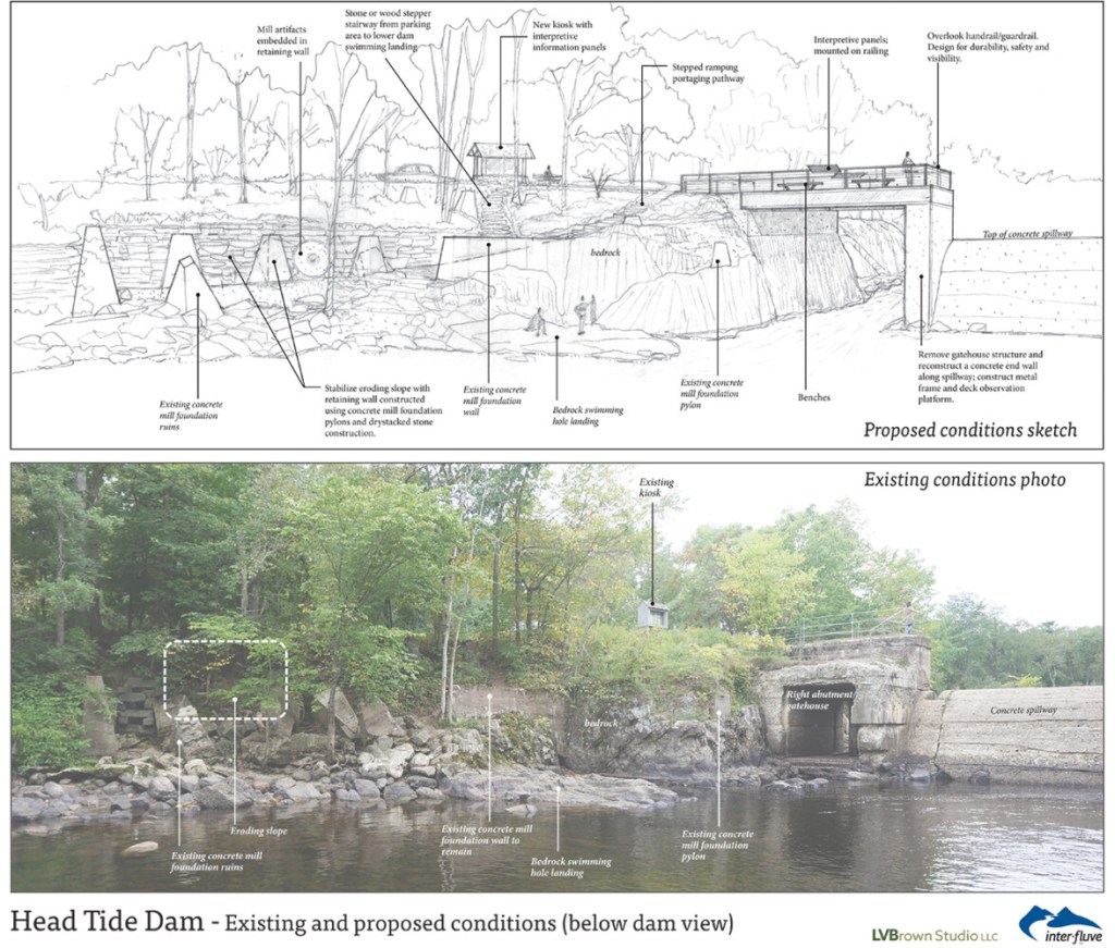 For the next two months, the dam site — located only a hundred feet or so upstream of the bridge where Head Tide Road crosses the river in the historic Head Tide village — will undergo reconstruction. The project includes opening up a 23-foot section of the dam’s south end, installing a new observation platform over that opening and developing the parking area just off Head Tide Road, as well as a path down to the river.
