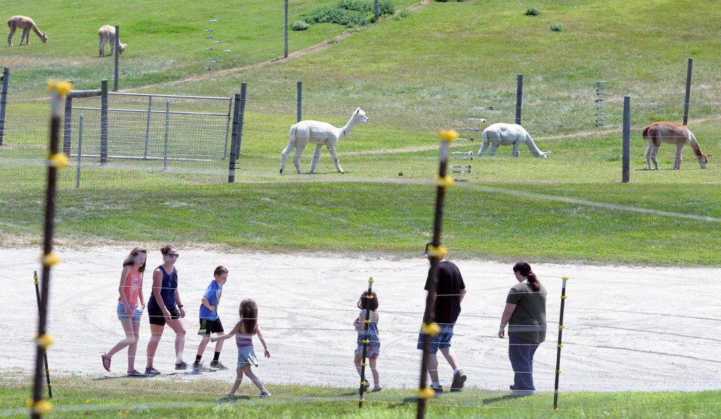 The Kurzynowski family of Saddle Brook, New Jersey, looks at alpacas Sunday at Misty Acres Alpaca Farm. Morning Sentinel photo by Molly Shelly