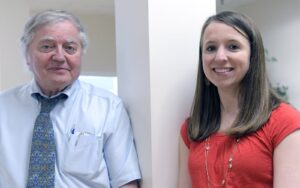 Rob Gordon and Courtney Yeager on Wednesday at the United Way offices in Augusta. Gordon is retiring from the United Way, and Yeager will take over his executive director role. Kennebec Journal photo by Andy Molloy