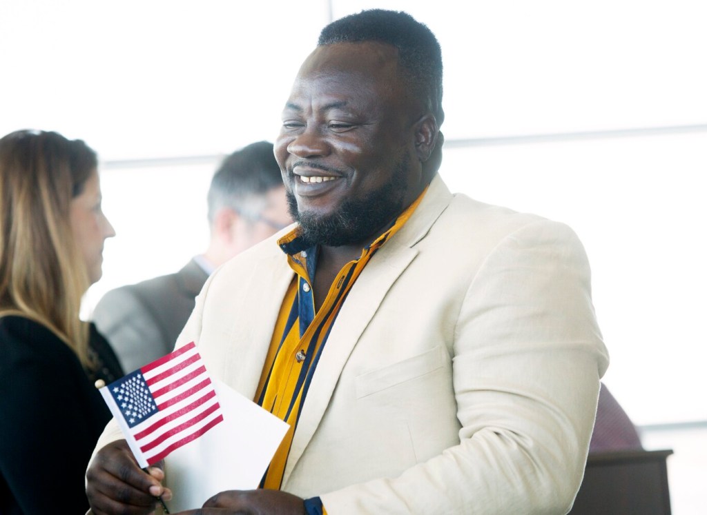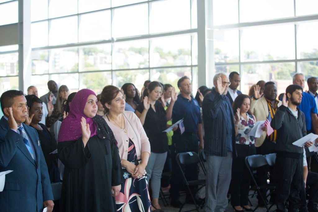 The immigrants, representing 35 countries, were presented with certificates of citizenship that they held while being photographed with friends and family after the ceremony.