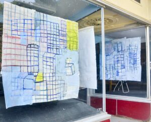 When they received the go-ahead from the Pouliots, Winslow and Jessen started working on getting the windows into display-ready, traveling to Augusta about once a week from their homes to scrub and wash the spaces, and consider what art to hang and how to best hang it. They tried different backdrops to better showcase their art by blocking the distraction of the space behind the windows.
