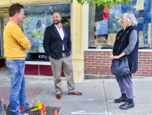 Co-owner of 347 Water St., Matt Pouliot, center, chats with artists Tom Jessen, left, and Kitty Winslow, right, who have works displayed in the windows there, Sept. 26 in downtown Augusta. Kennebec Journal photo by Joe Phelan Buy this Photo