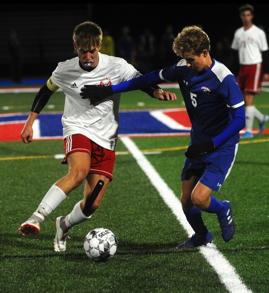 In overtime it was Cony’s turn for a close call. The ball was sent in and took a high bounce over to Bryton Kieltyka, who was alone to the right of the net. The senior had to rush his try with the Eagles defense bearing down on him, however, and the try flew high of the goal.