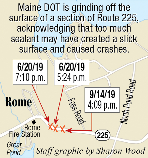 Since the sealant was applied on an area of Route 225 in Rome, there have been three incidents involving cars going off the road in that location, all of which occurred during wet conditions, according to crash reports from the Maine Department of Public Safety and the transportation department’s public crash query tool.