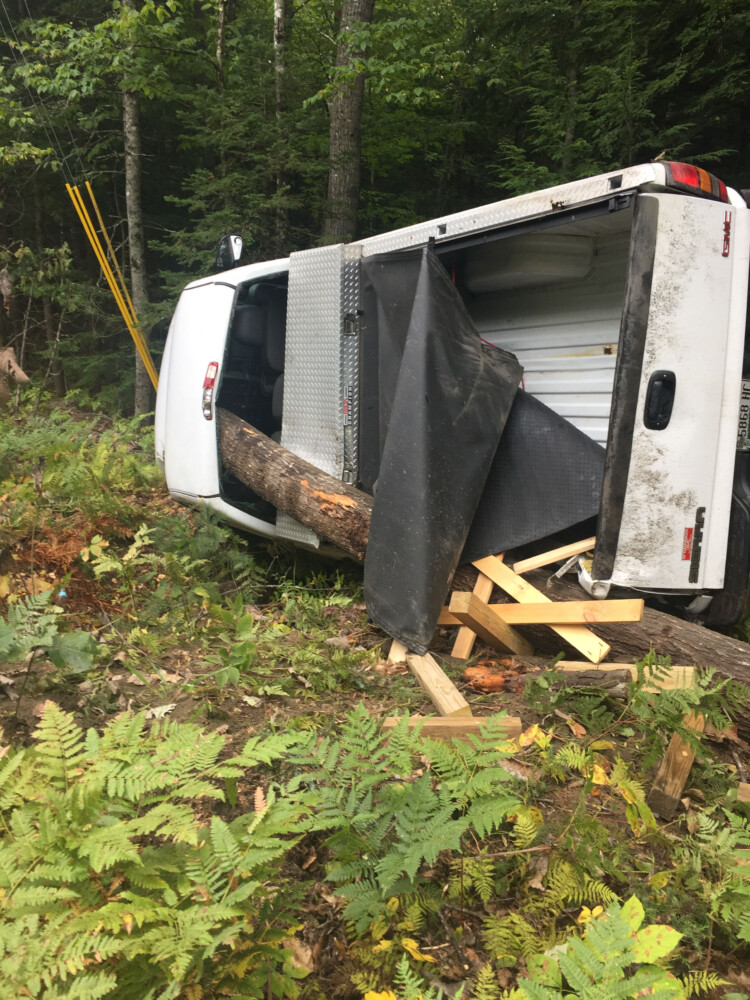 Tom Streznewski said that the State Trooper who responded to the accident he was involved in on Route 225 in Rome on Sept. 14, 2019, told him that when they see trucks looking like his, the drivers are usually dead. Streznewski said he was crouched by the steering wheel. The tree punched through the back window and into the driver’s headrest. Tom Streznewski photo