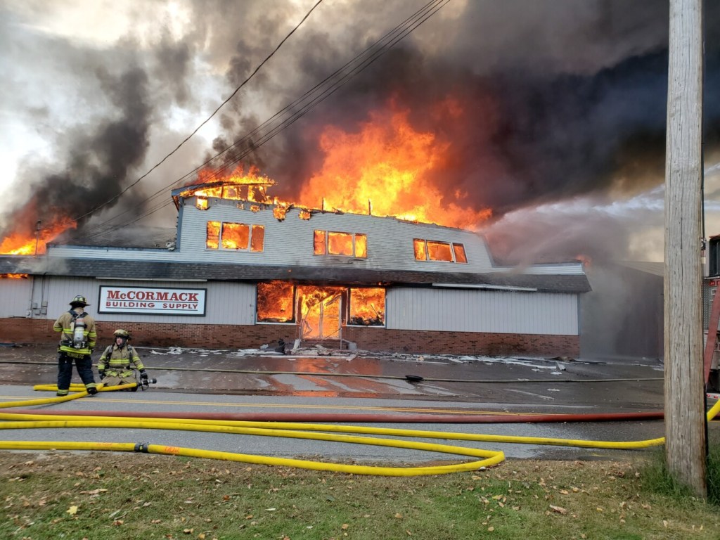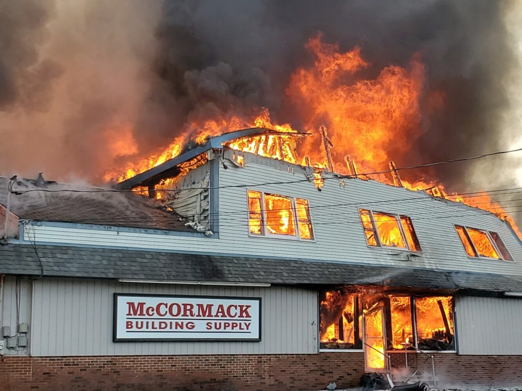 A McCormack Building Supply staff member who declined to be identified said on scene that they had just started paving the parking lot at the property on Friday and that everyone got out safely. The staff member also said the whole building had caught fire and not just a specific section of the property, and the employee did not know how the fire started.