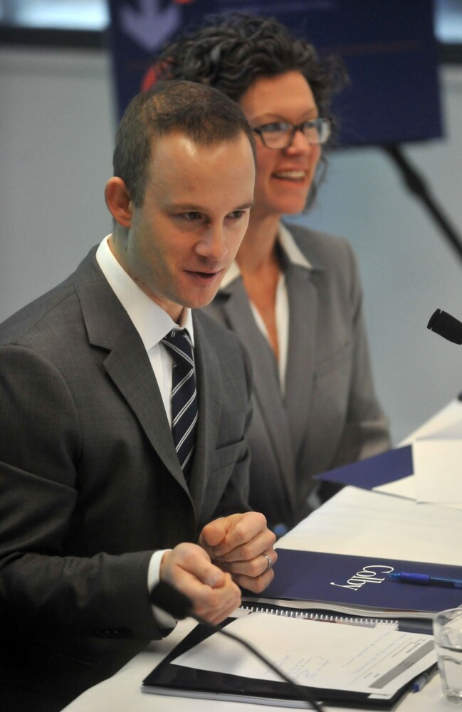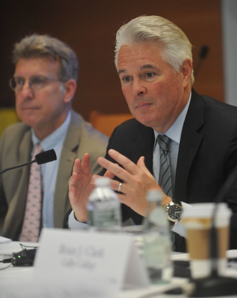Colby College’s Brian Clark offers input Tuesday during the college’s release of an economic impact report in Waterville.