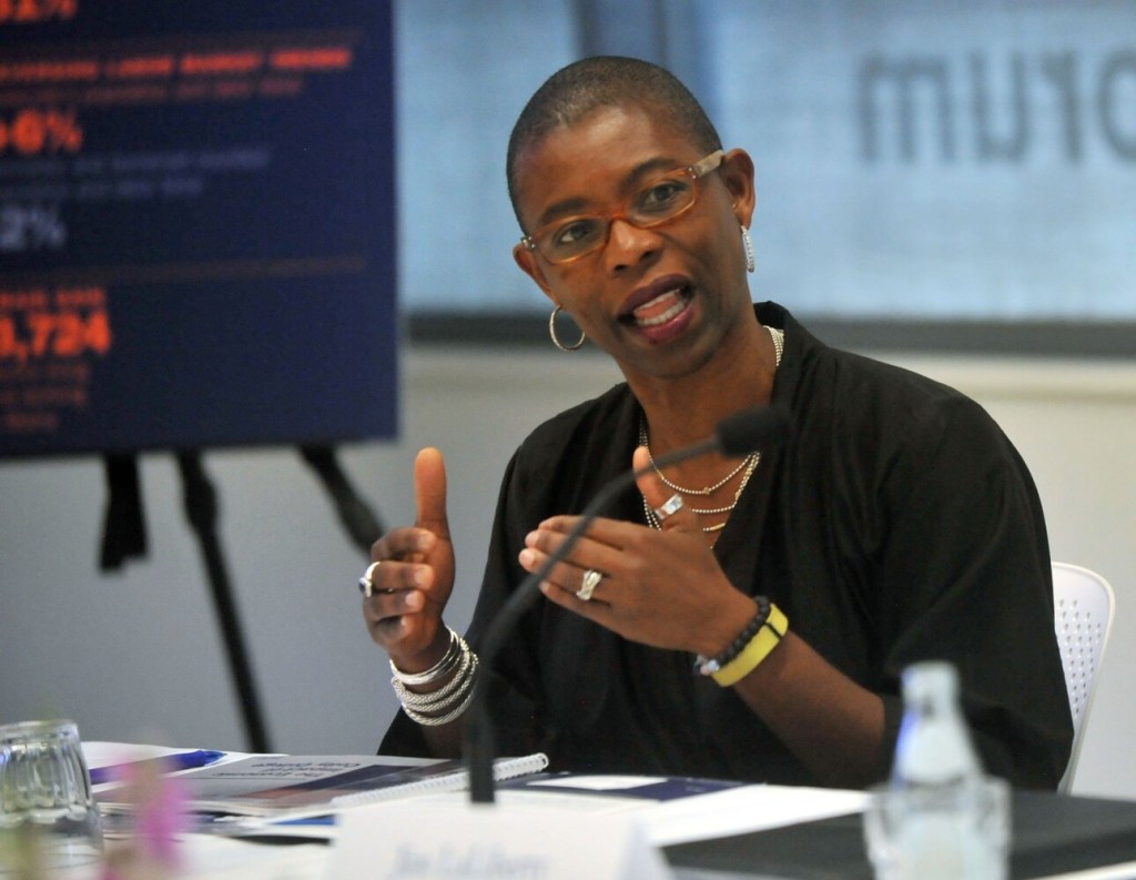 Colby College’s Karlene A. Burrell-McRae offers input Tuesday during the college’s release of an economic impact report in Waterville.