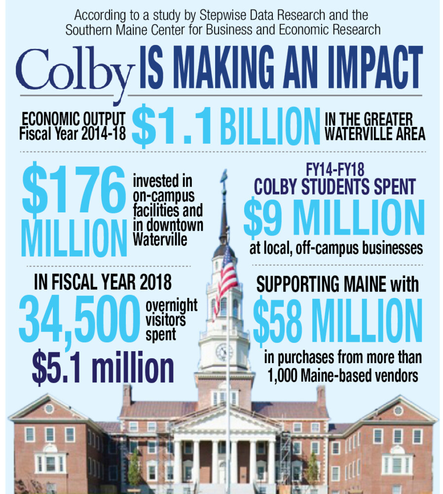 For instance, from 2014 to 2018, Colby’s operations, investments and visitor and student spending resulted in an economic output of $1.5 billion in Maine, $1.1 billion of which was expended in greater Waterville, according to the study.
