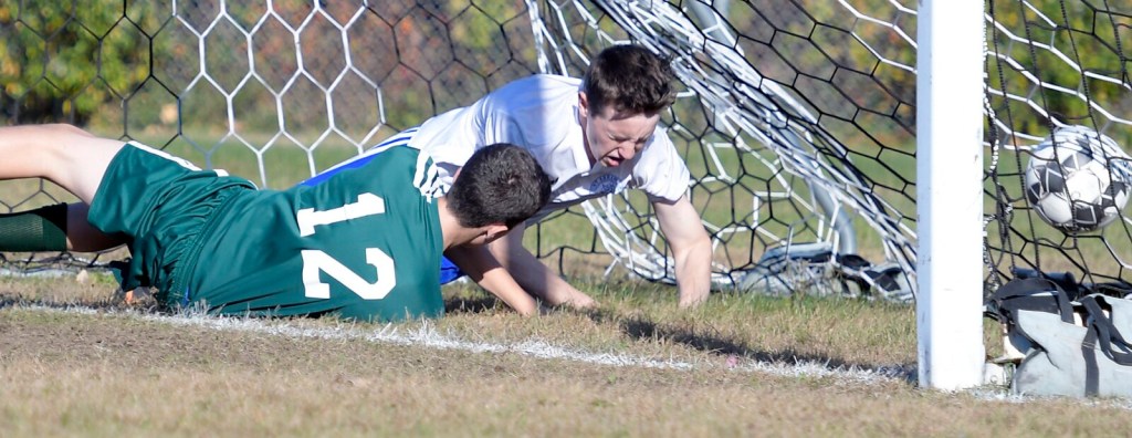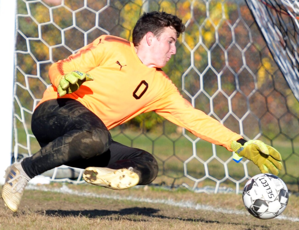 Winthrop goalie Jake Smith stops a shot from Mt. Abram’s Tyson Hill during a Mountain Valley Conference soccer game Monday O in Winthrop. Kennebec Journal photo by Andy Molloy
