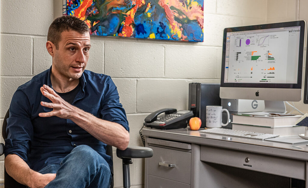 Andrew Kennedy, assistant professor of chemistry and biochemistry at Bates College in Lewiston, explains some of the properties of Bobcat339, a molecule created by a Bates College team. Andree Kehn/Sun Journal Buy this Photo