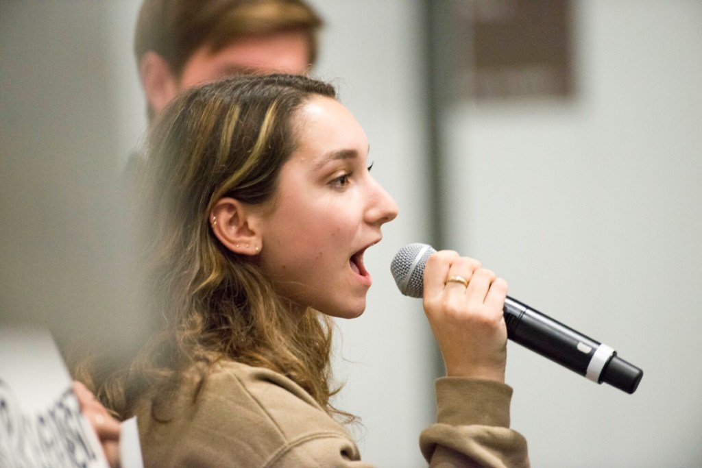 During a question-and-answer session Wednesday at Ostrove Auditorium at Colby College, junior Rachel Powers pointedly asks Paul LePage about his use of racially charged language during his tenure as Maine governor. Morning Sentinel photo by Michael G. Seamans