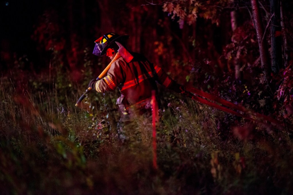 Firefighters with hoses and axes trekked into the woods to put out the fire.