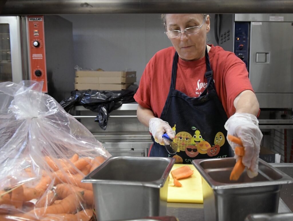Chelsea Elementary School assistant chef Linda Duplessis slices carrots on Tuesday October 29 delivered by the Emery Farm. Staff photo by Andy Molloy