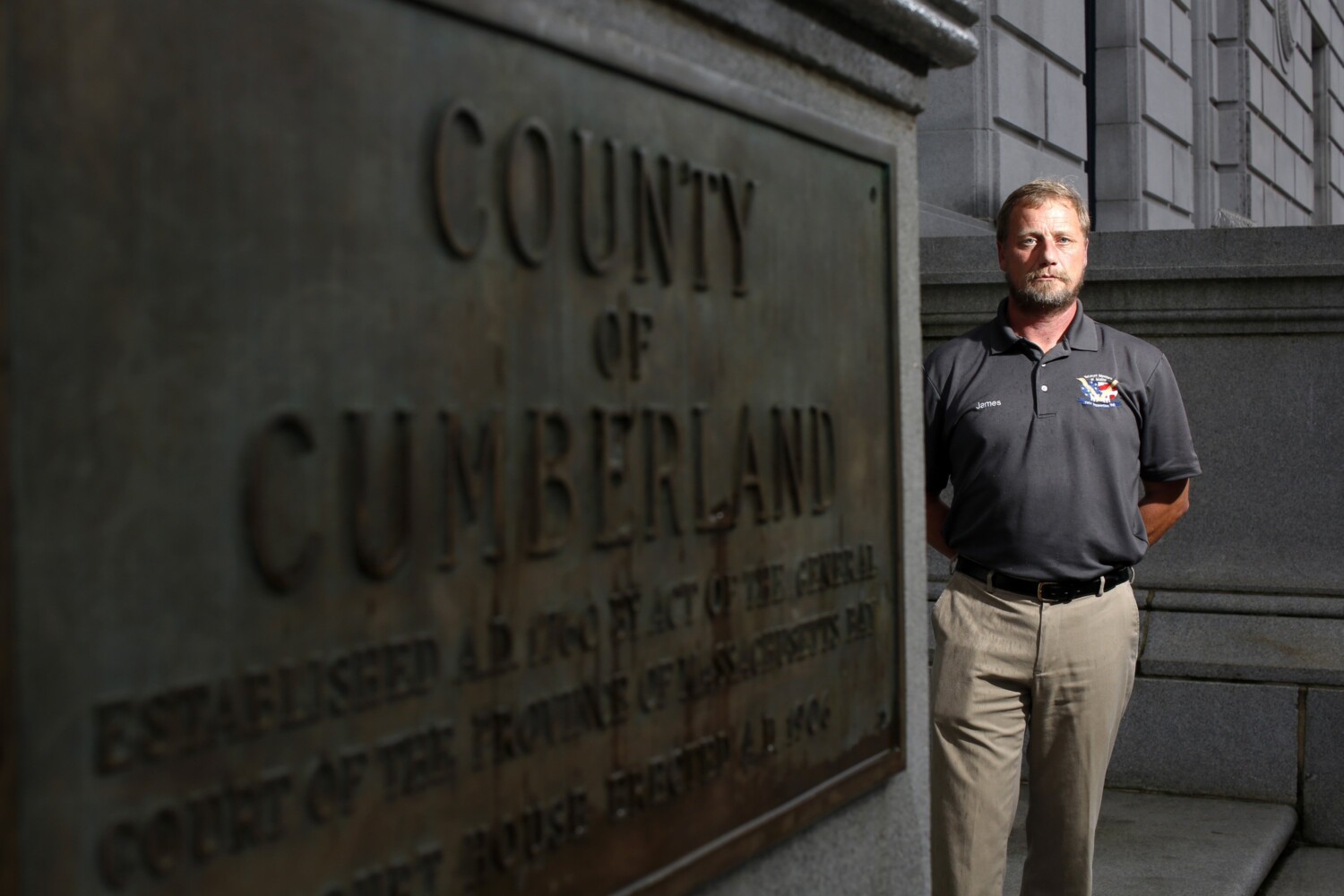 James Orr poses for a portrait outside Cumberland County Superior Court last month. Orr helps veterans who need help with legal or other problems through his role as president of Veteran Mentors of Maine. Orr joined the Army out of high school and served 24 years. Ben McCanna/Staff Photographer