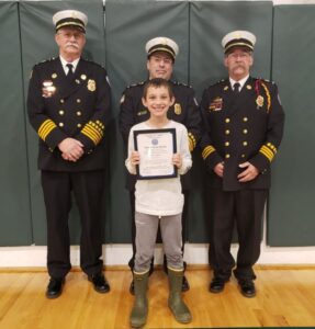 Eben Laliberte, front, was recognized Monday by the Rangeley Fire-Rescue Department and town of Rangeley, for his quick thinking and instincts in realizing something was wrong at his family’s home on Nov. 26 after hearing a smoke detector going off. Behind Laliberte are from left, Fire-Rescue Assistant Chief Dennis Marquis, Chief Michael Bacon and Deputy Chief Tony Clark. Rangeley Fire-Rescue Department photo