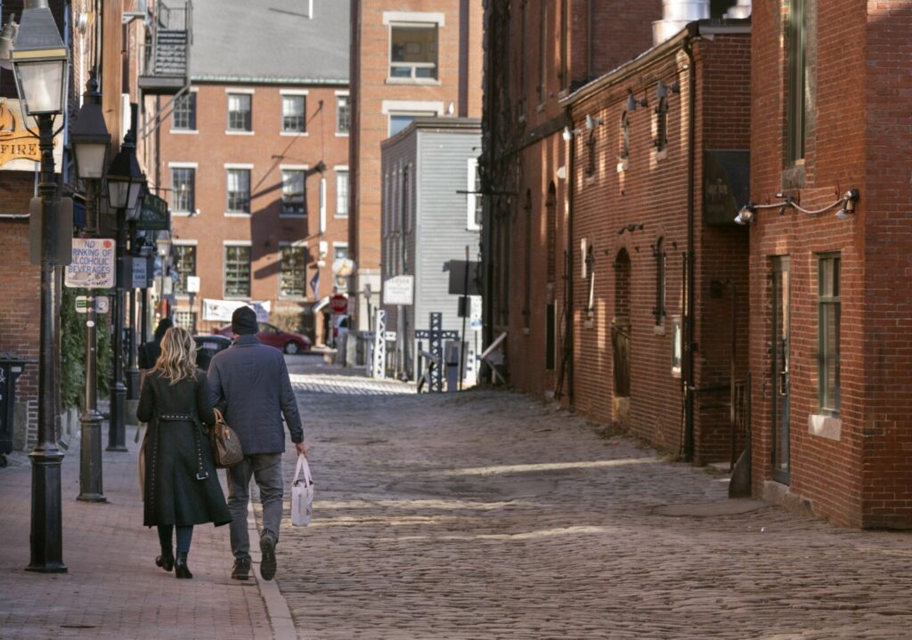 During the day, Wharf Street is an ideal backdrop for photos, a narrow, bumpy, undulating cobblestone alley lined with historic brick buildings in the heart of Portland’s Old Port.