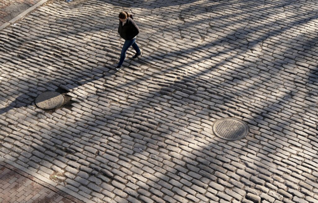 A woman walks along an uneven part of Dana Street in Portland’s Old Port last week. City officials will meet next month with businesses owners along Dana and Wharf streets to discuss proposals to make the footing a little easier on pedestrians, among other things. Often referred to as a cobblestone street, it is actually made up of quarried granite blocks. Staff Photo by Gregory Rec Buy this Photo