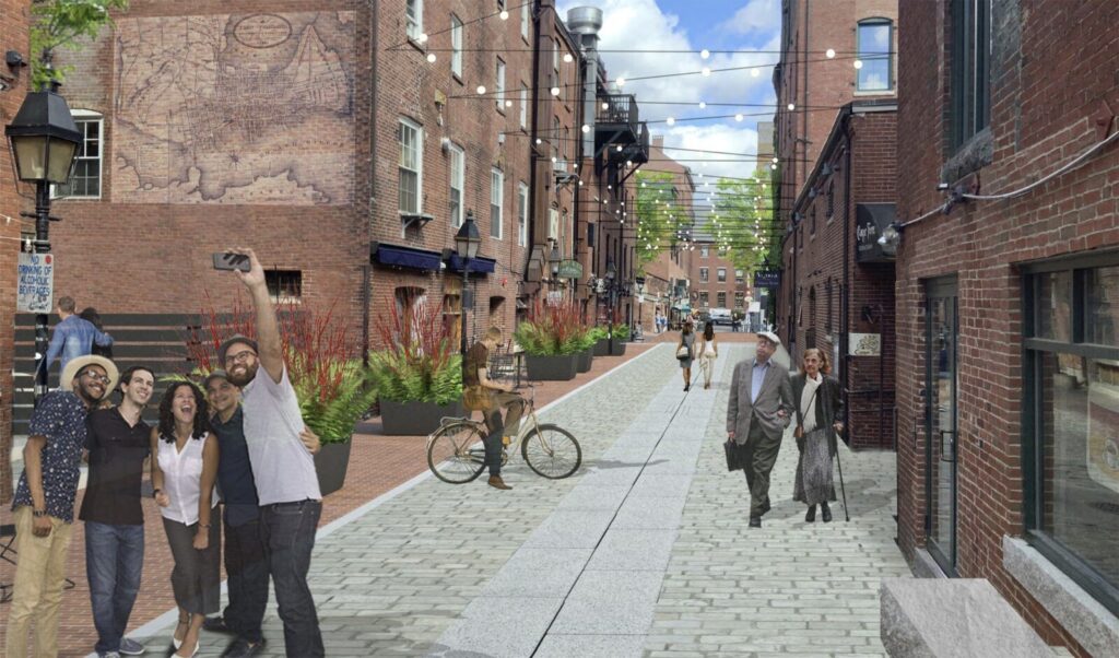 More dramatic changes are being eyed for Dana Street, a cobblestone road that extends up from Commercial Street and has street parking for about a dozen vehicles. One concept would create a “pocket park” between Wharf and Commercial streets with granite benches, trees and bike racks. Another shows a shared street, with expanded pedestrian areas, but preserving parking spaces. Some options would maintain vehicle access on Dana from Fore Street, while others would eliminate it.