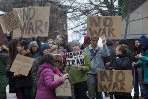 The protesters, many of them veterans, expressed fear that Friday’s U.S. drone strike against Qassem Soleimani, who Pentagon officials claimed was planning attacks on Americans, would lead to war with Iran.