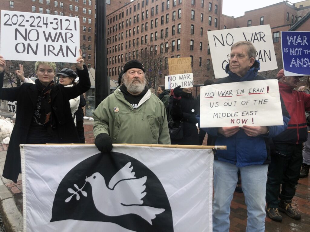 More than 60 demonstrators gathered at Congress Square Park in Portland on Saturday to call for peace after the killing of a top Iranian general escalated an ongoing conflict with the United States.