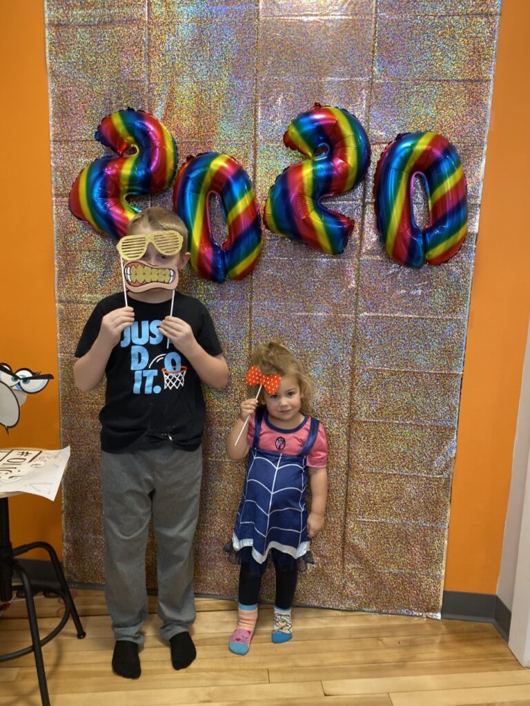 Austin Pratt, left, and Genevieve Fellman posing in the 2020 photo booth during the Western Maine Play Museum’s Noon Year’s Eve in Wilton. Photo courtesy of the Western Maine Play Museum